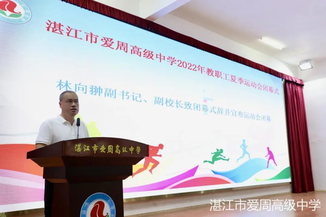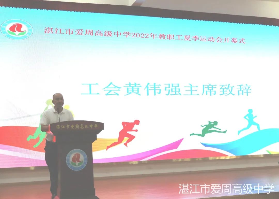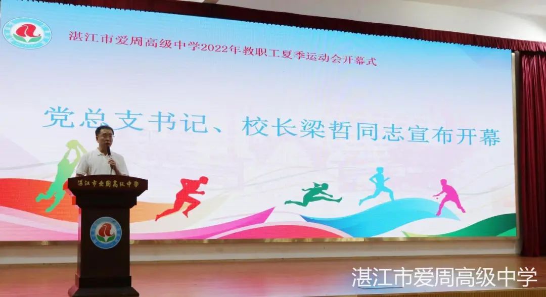 运动会在激昂的国歌声中拉开了帷幕,学校工会黄伟强主席致辞,我校党总支部书记、校长梁哲同志郑重宣布2022年湛江市爱周高级中学首届教职工夏季运动会正式开幕。扬帆把舵,奋勇拼搏,团结一致,争创辉煌。这既是一次体育赛事,又是一次友谊的聚会,还是一次展示湛江爱高教职工精神面貌的盛宴。