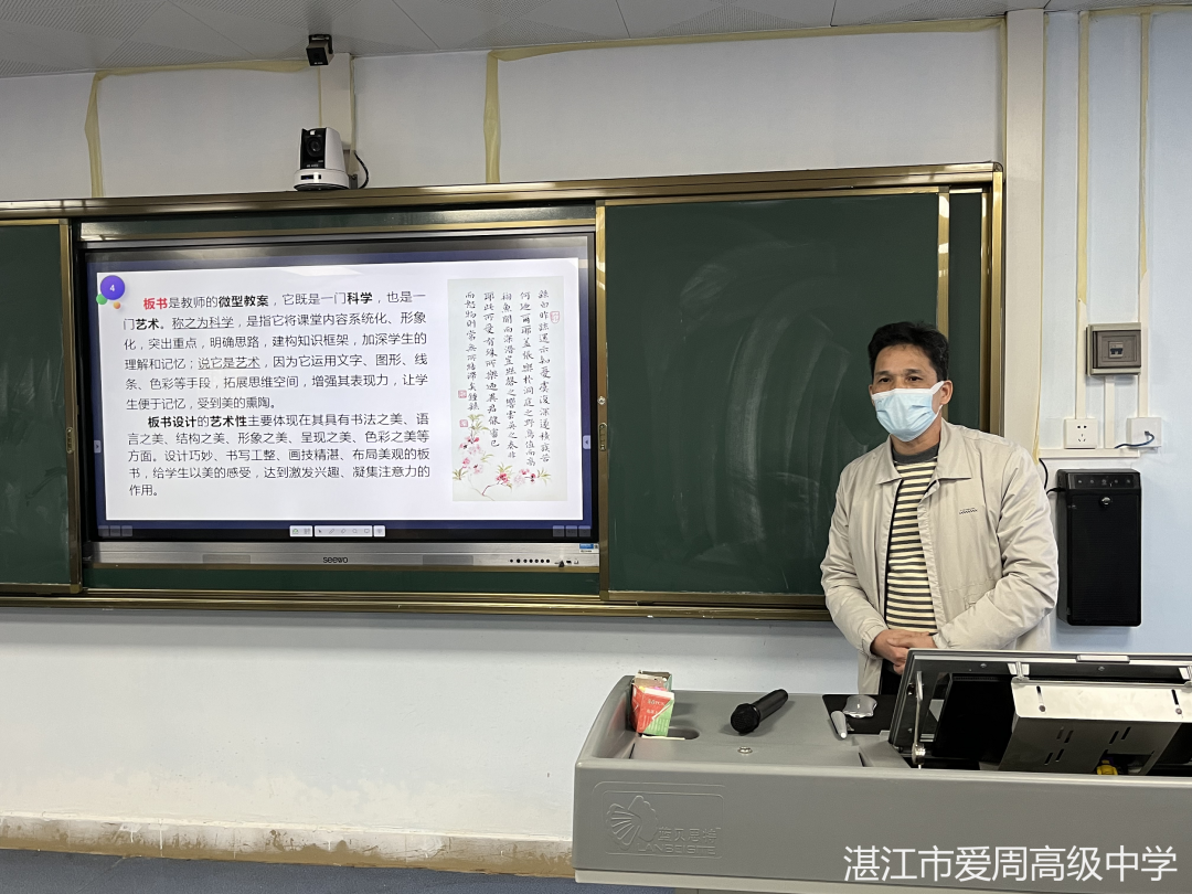 接着,我校艺术教研组长、广东省名师工作室主持人何仁老师开讲了主题为《板书设计》的知识讲座。何老师主要从“板书的重要性”、“板书设计的要求与方法”、“楷书笔法要点与偏旁结构规律”、“粉笔板书常见缺点”、“板书优秀作品欣赏”这五方面展示了中华传统文化的魅力。板书是教师的微型教案,它既是一门科学,也是一门艺术,他将课堂内容系统化,形象化,起到了突出重点,明确思路,建构知识框架,加深学生的理解和记忆的作用。何老师运用文字,图形,线条,色彩等手段美化了板书设计,拓展思维空间,增强其表现力,让学生在便于记忆的同时受到美的熏陶。