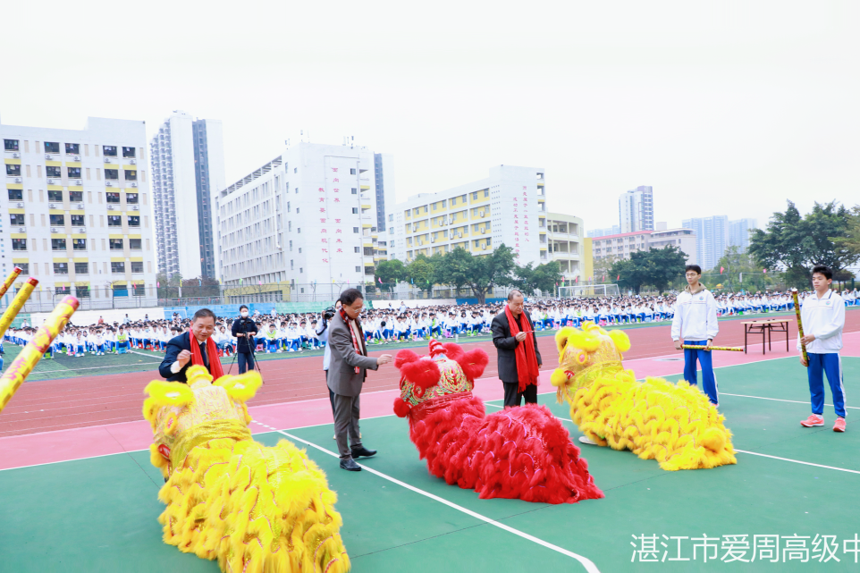 点睛仪式后,醒狮队进行了精彩的表演。在轻重缓急的锣鼓声中,三头雄狮在空中跳跃,翻舞,高难度的动作展示了狮子的威风凛凛。最后瑞狮吐对联“跃龙门竞标争先,绘宏图比学赶超”,更是赢来了全校师生雷鸣般的掌声。龙狮飞舞,舞出了新春的喜悦,也舞出了我们湛爱高人团结拼搏、开拓进取、奋勇争先的精气神!