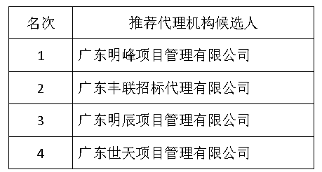 本项目依据评审结果,推荐(4)名候选人。学校党总支委会按照各有效投标人综合情况排名。其中,排名第一的供应商(广东明峰项目管理有限公司)确定为第一候选人,排名第二的供应商(广东丰联招标代理有限公司)为第二候选人,排名第三的供应商(广东明辰项目管理有限公司)为第三候选人,排名第四的供应商(广东世天项目管理有限公司)为第四候选人。