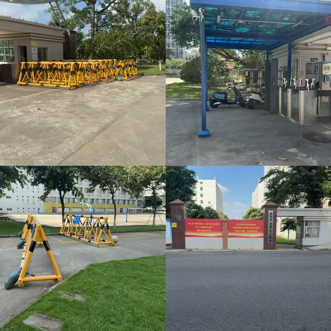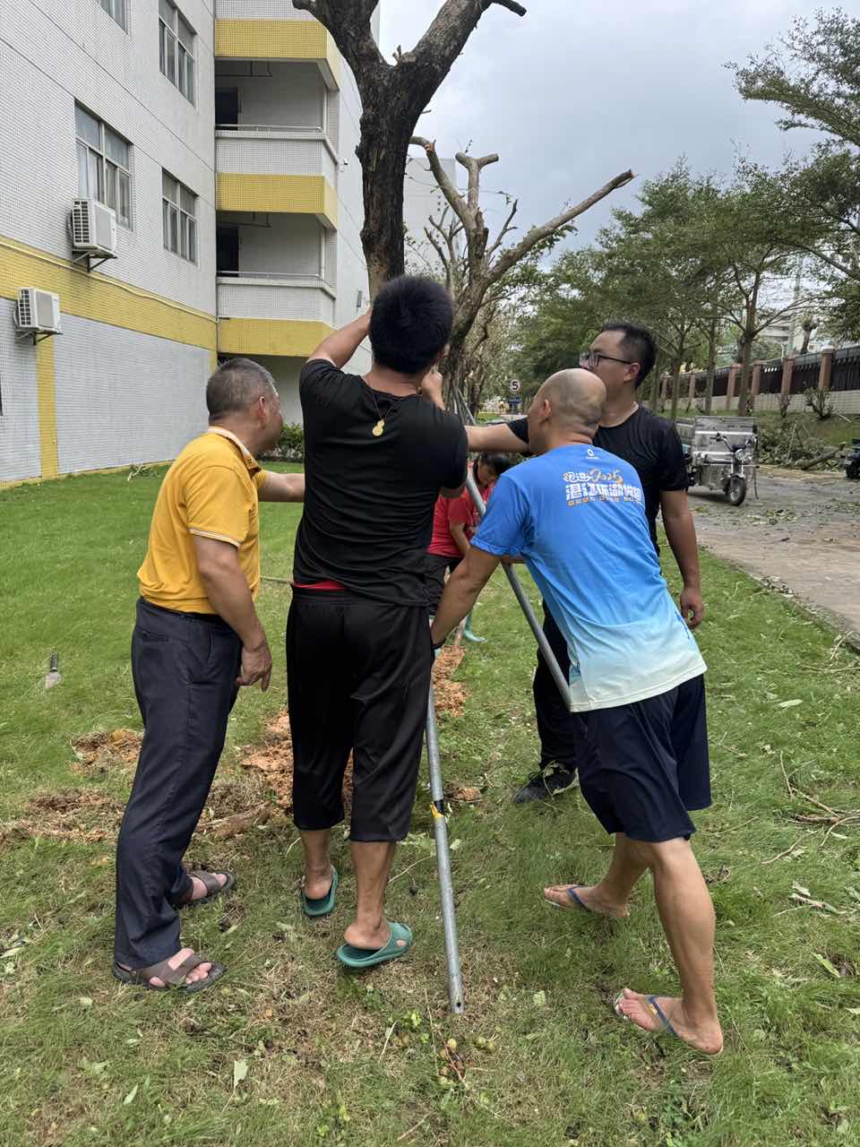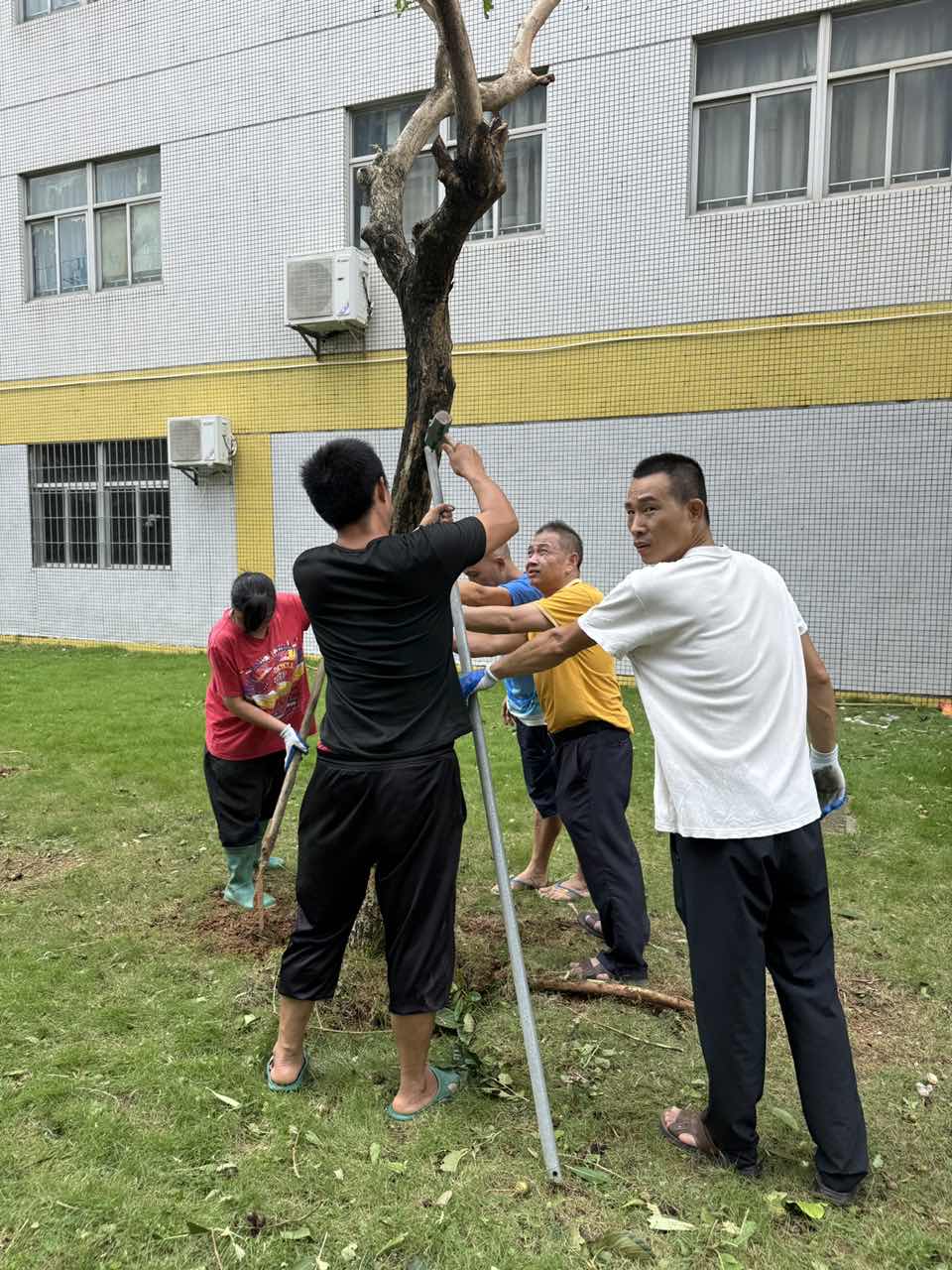 10月6日,台风过境,校园满目疮痍。运动场主席台顶部棚架被吹飞变形,运动场1号门被风吹变形,户外LED屏损坏,足球场比赛场地投光灯组损坏,学生宿舍热水器、水箱被吹坏,还有大小树木20棵吹倒。面对此场景,陈生校长带领工会黄伟强主席、总务处陈环平主任、黄中秋副主任、教导处白果副主任,以及四位后勤人员——全国明、陈泽华、招进兴、李少菊,毅然留校奋战。他们修正宣传板、扶树木、清断枝、扫落叶、运垃圾⋯⋯他们用汗水,一点点扫去台风留下的伤痕,只为尽快还师生一个安全、整洁的校园。