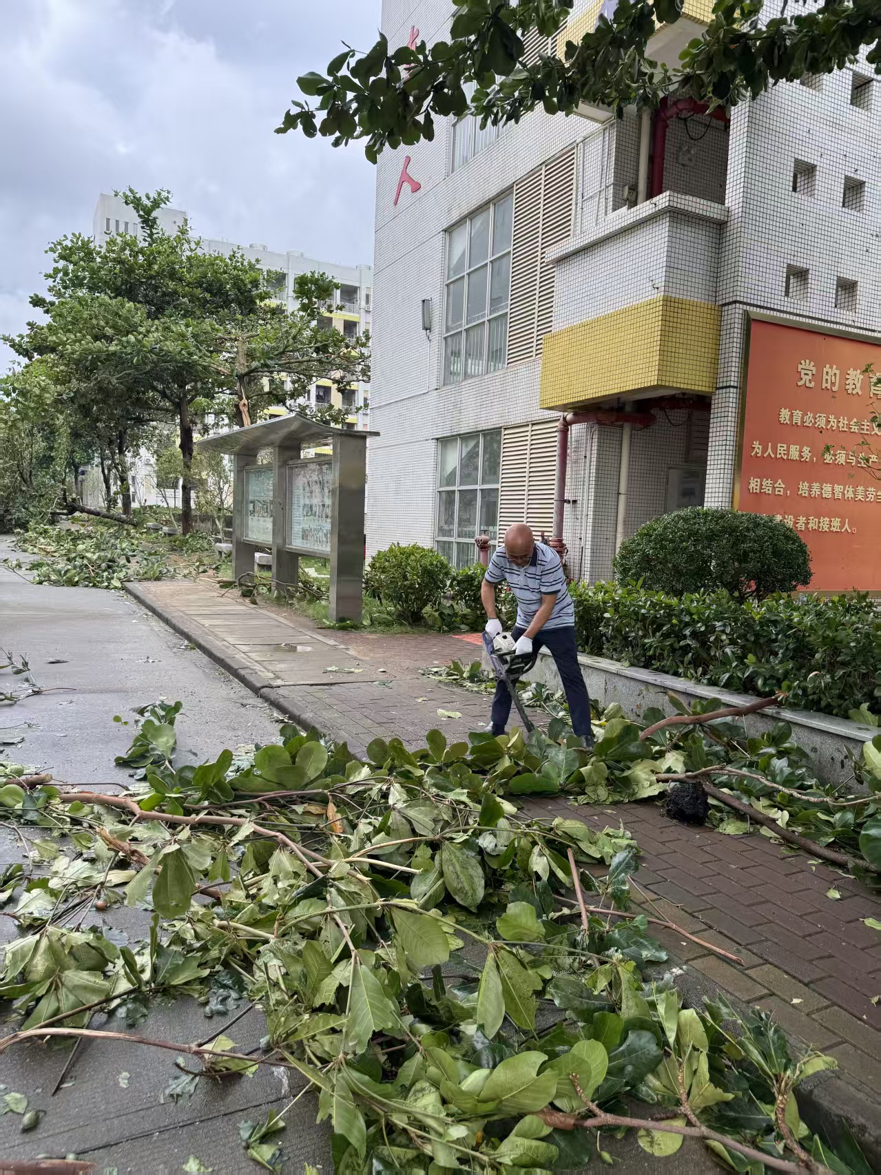 ▲台风前夕校园准备防御工作