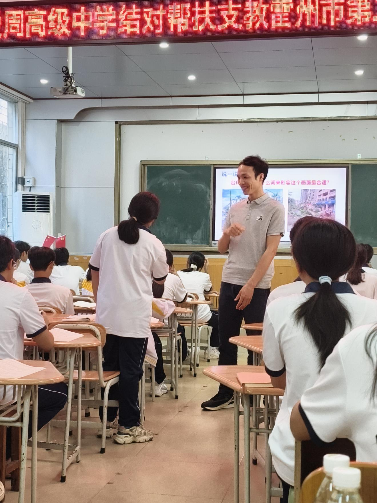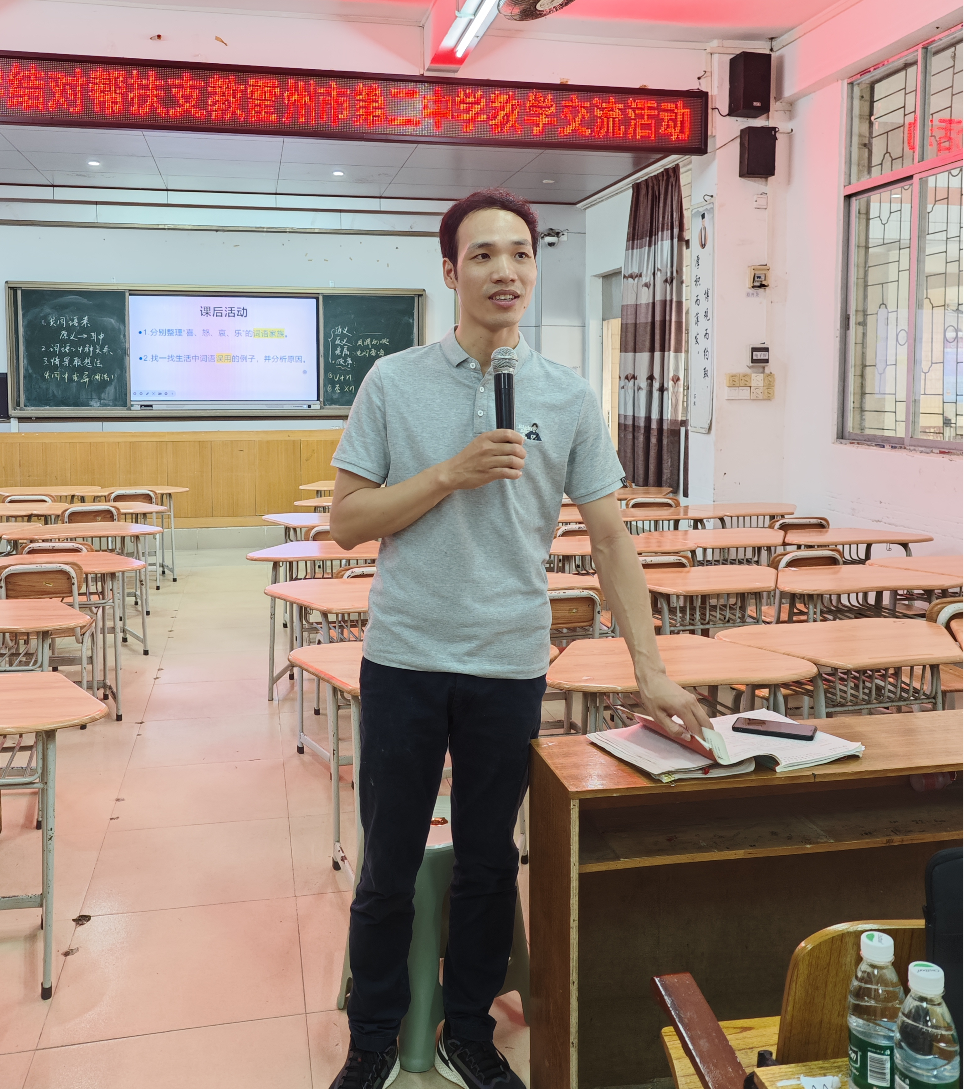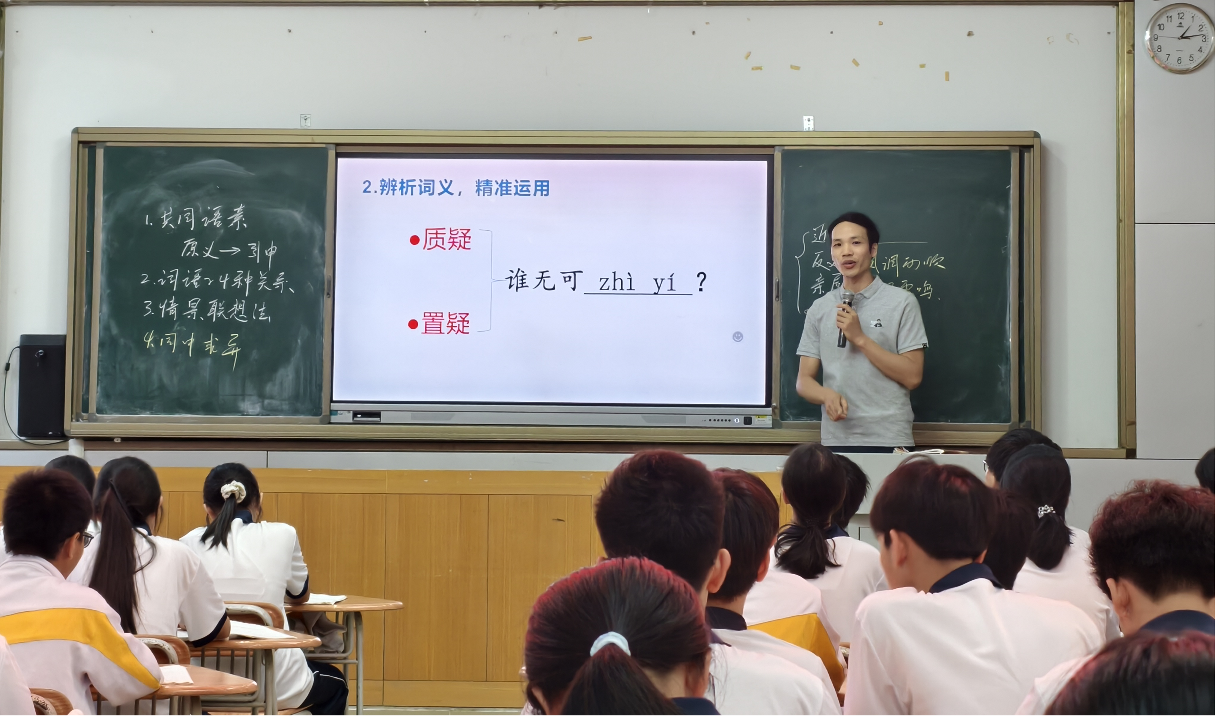 我校柯胜智副校长为雷州二中高一6班的学生带来一节精彩纷呈的示范课——《词语的积累与运用》。他以“麦德姆”台风为切入点,紧密联系学生生活经验,运用“情景联想法”生动阐释“词语的构建”,引导学生初步搭建语言知识网络。课堂以部编版高中语文必修上册第八单元“词语积累与词语解释”的学习目标为纲,在厘清“语素、字、词”核心概念的基础上,系统拓展了词语的“近义、反义、亲属、顺序”四种关系。通过精当的案例剖析,柯副校长有效调动了学生的既有词汇储备,激发了主动积累与探索的兴趣,充分彰显了语文学科核心素养的培养导向。