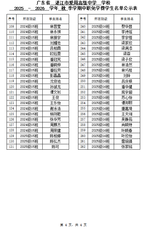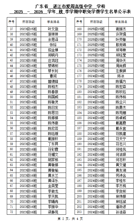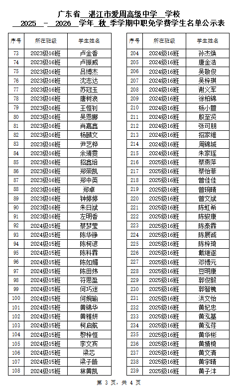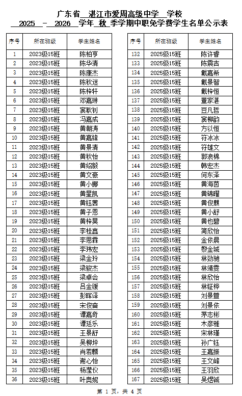 湛江市爱周高级中学2025-2026学年秋季学期中职国家免学费受助学生名单公示