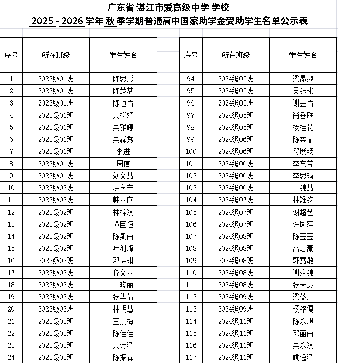 湛江市爱周高级中学2025-2026学年秋季学期普通高中国家助学金受助名单公示