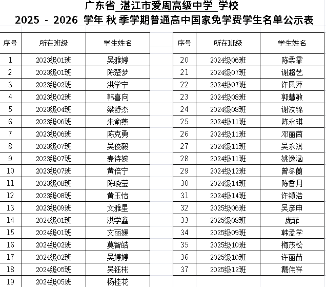 湛江市爱周高级中学2025-2026学年秋季学期普通高中国家免学费学生名单公示