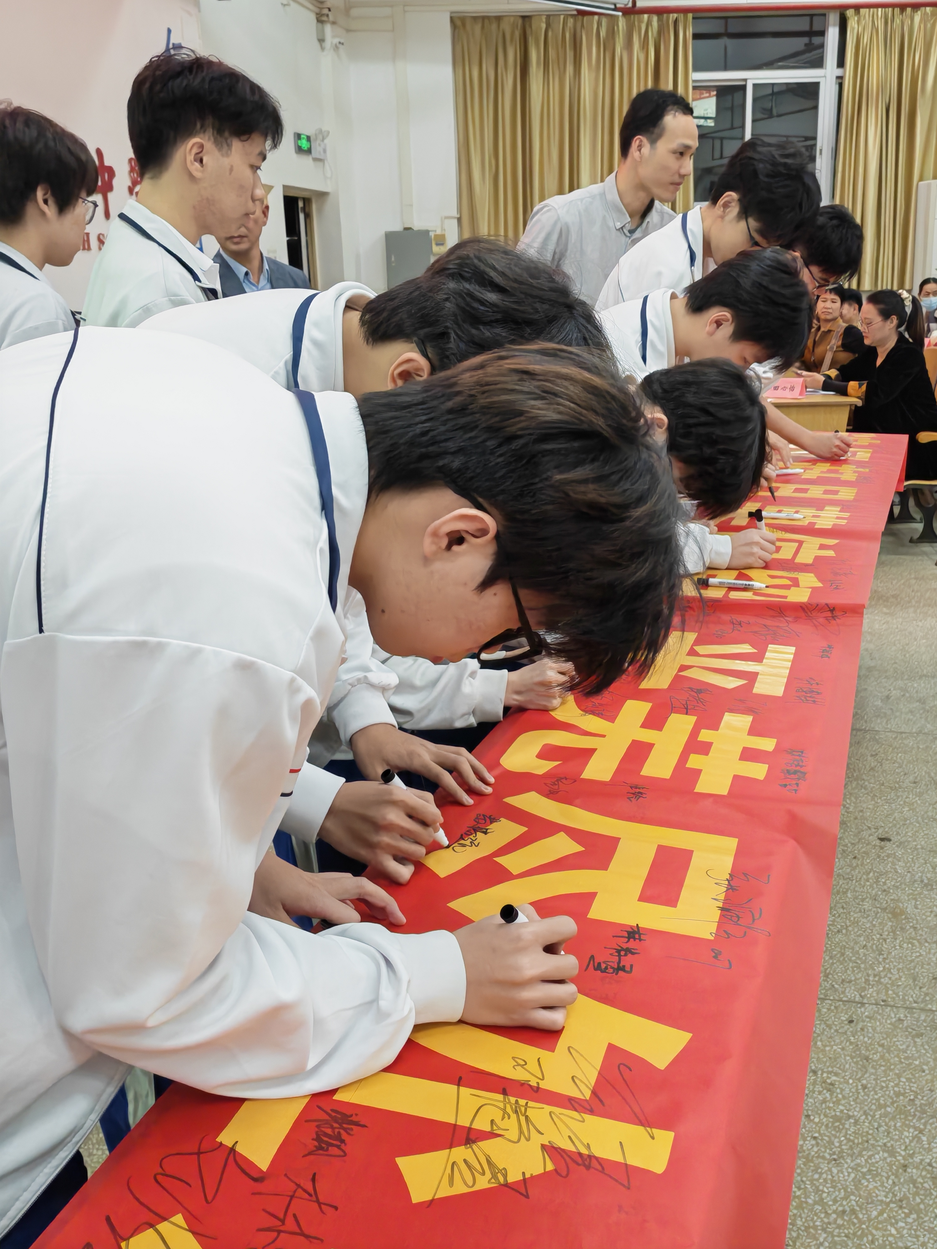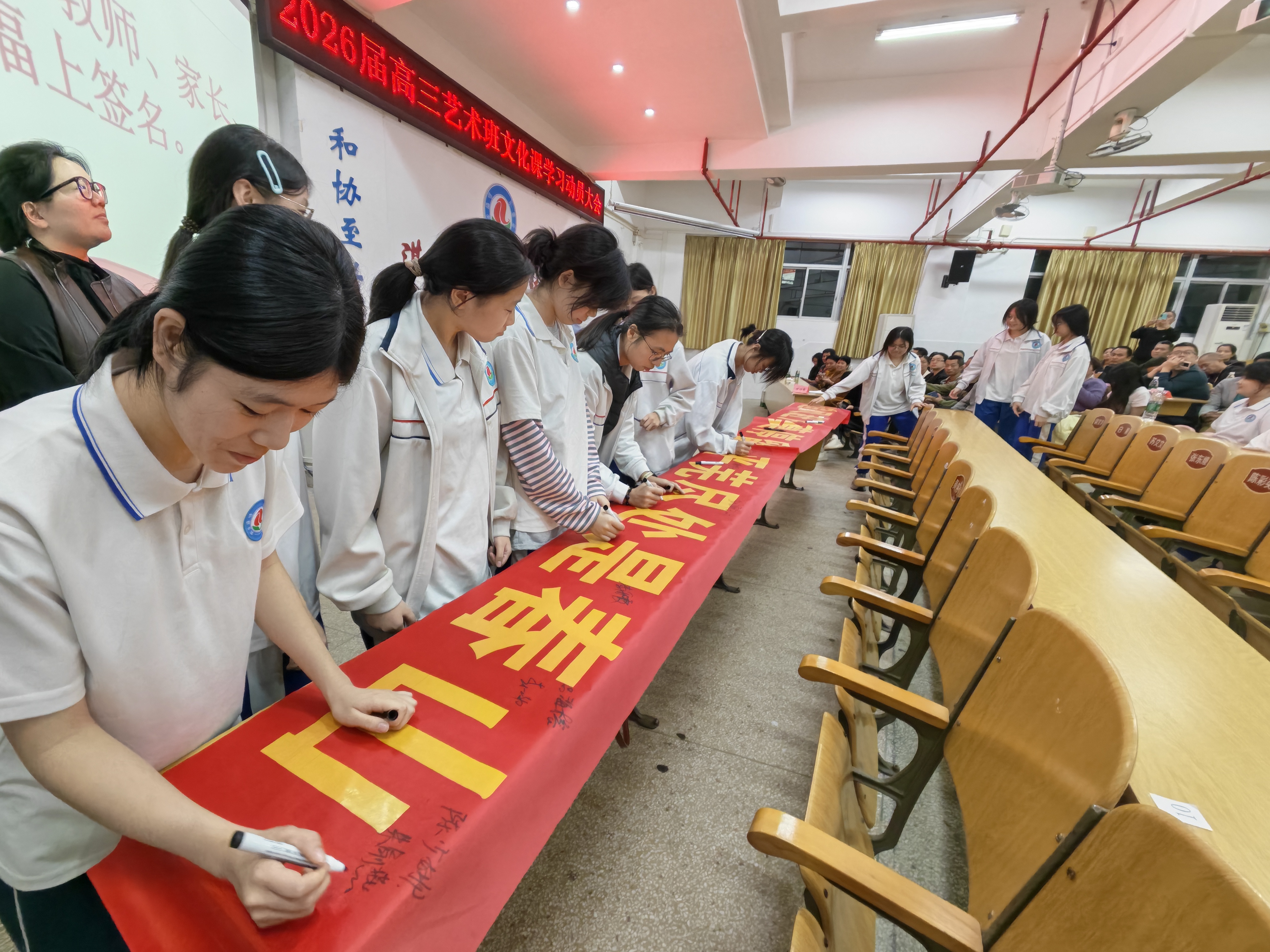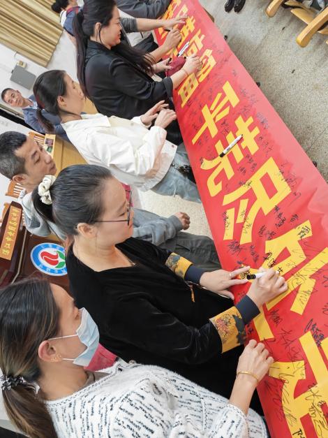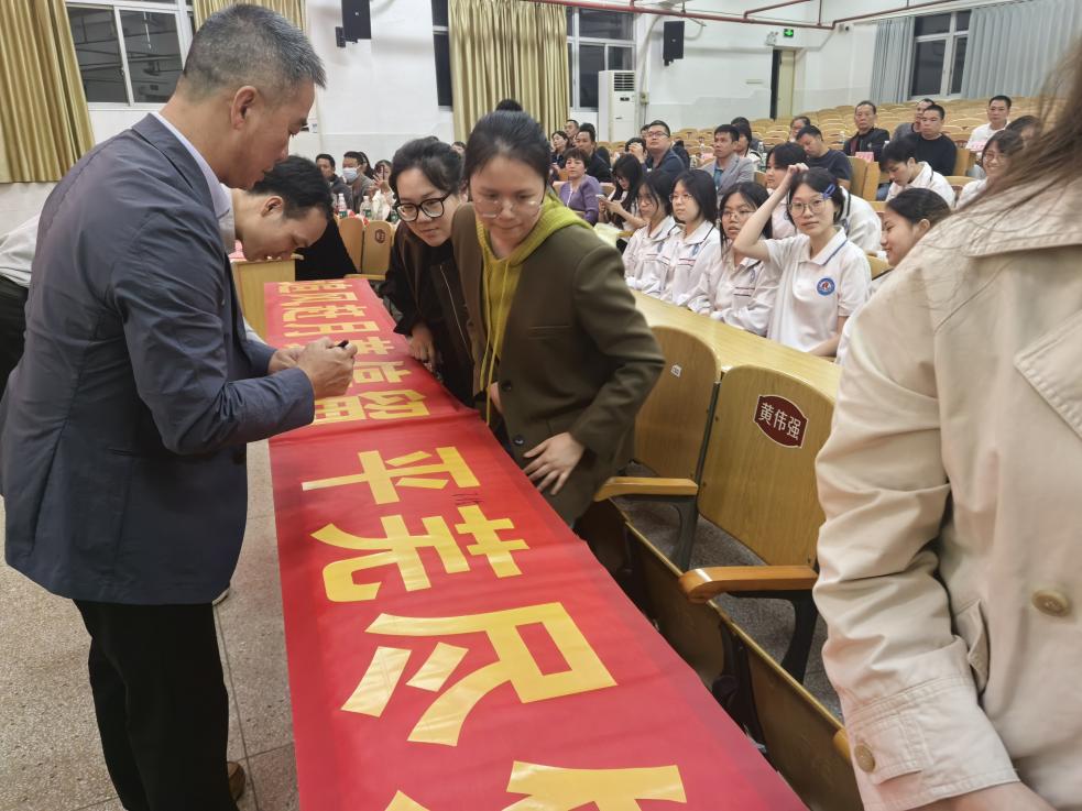 宣誓礼成,学校领导、老师、家长和学生们依次上前,在励志横幅上郑重署名。一笔一画,是承诺,是期盼,更是家校师生同心共赴未来的见证。