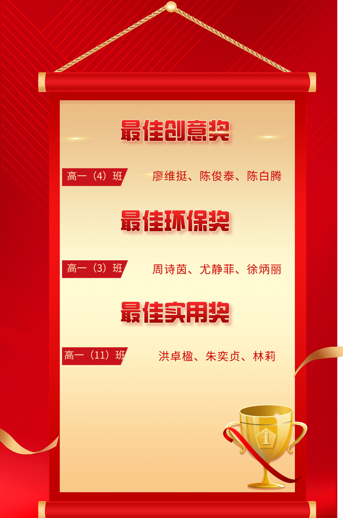 随着一件件作品逐渐成形,赛场也迎来评审环节。评委们从环保性、创意性、实用性等维度进行综合评价,最终评出一、二、三等奖及最佳环保奖、最佳创意奖、最佳实用奖等单项奖。这些作品不仅构思巧妙、制作精良,更生动诠释了“变废为宝”的绿色理念,展现出同学们良好的审美素养和动手能力。