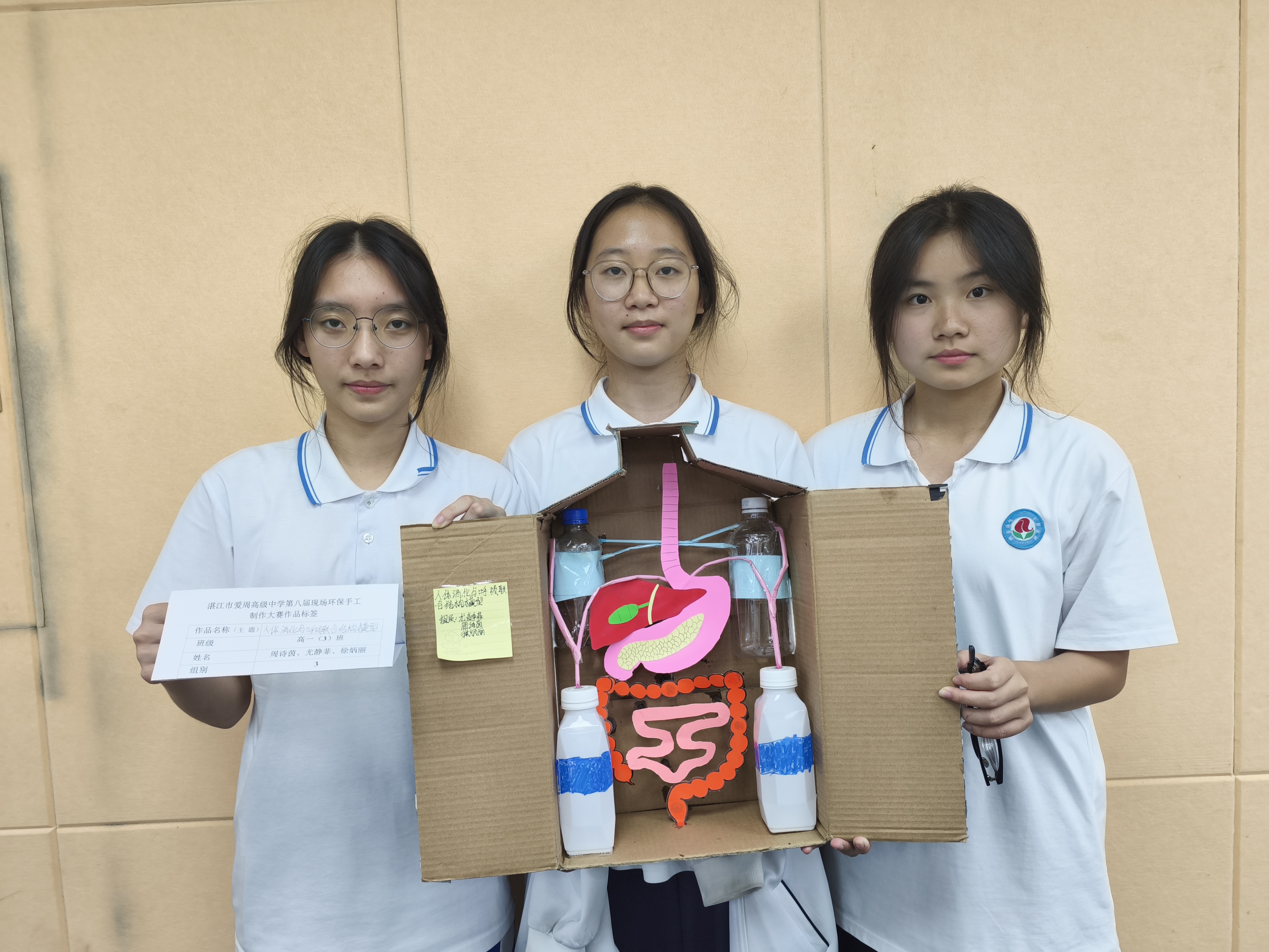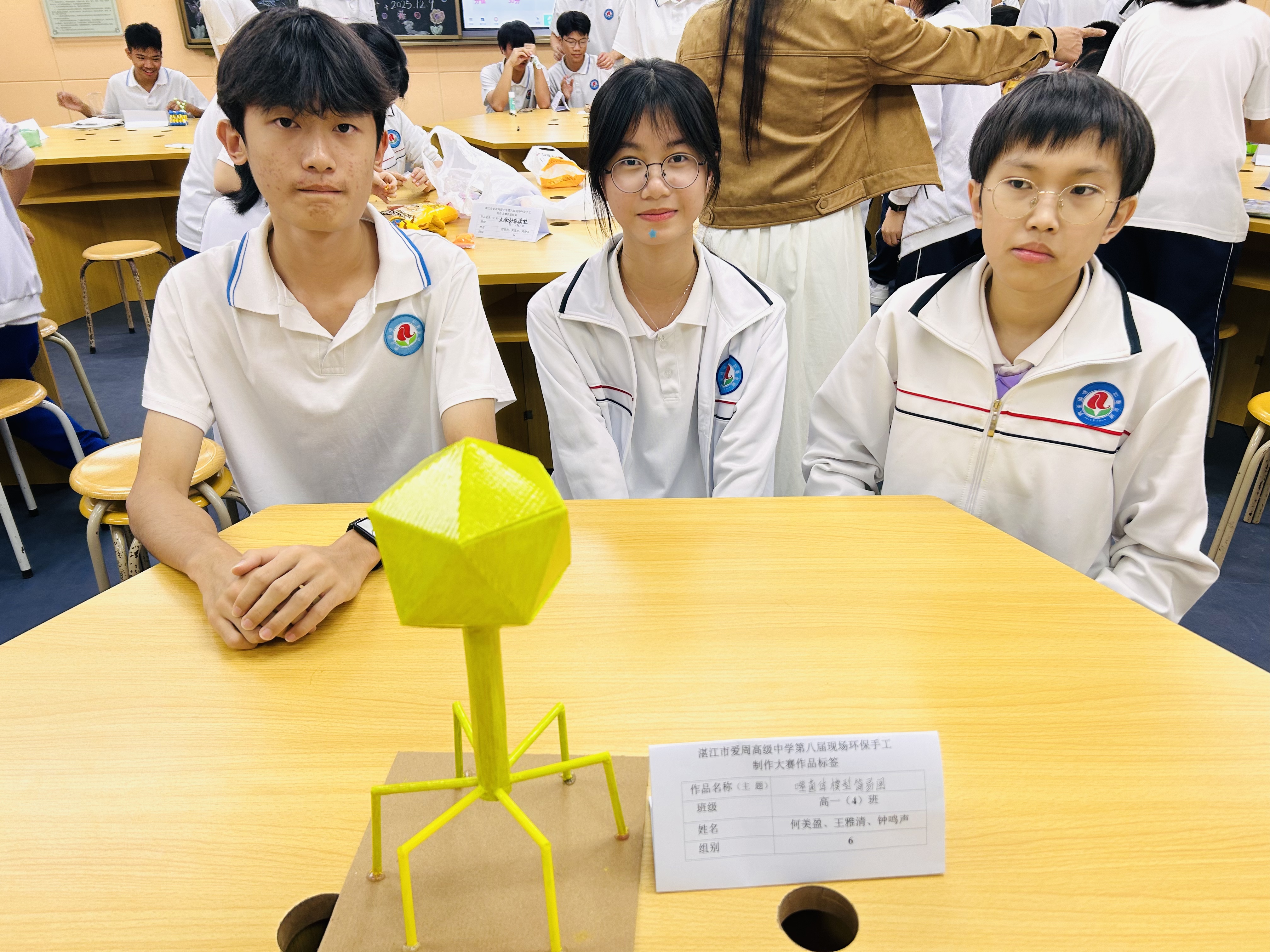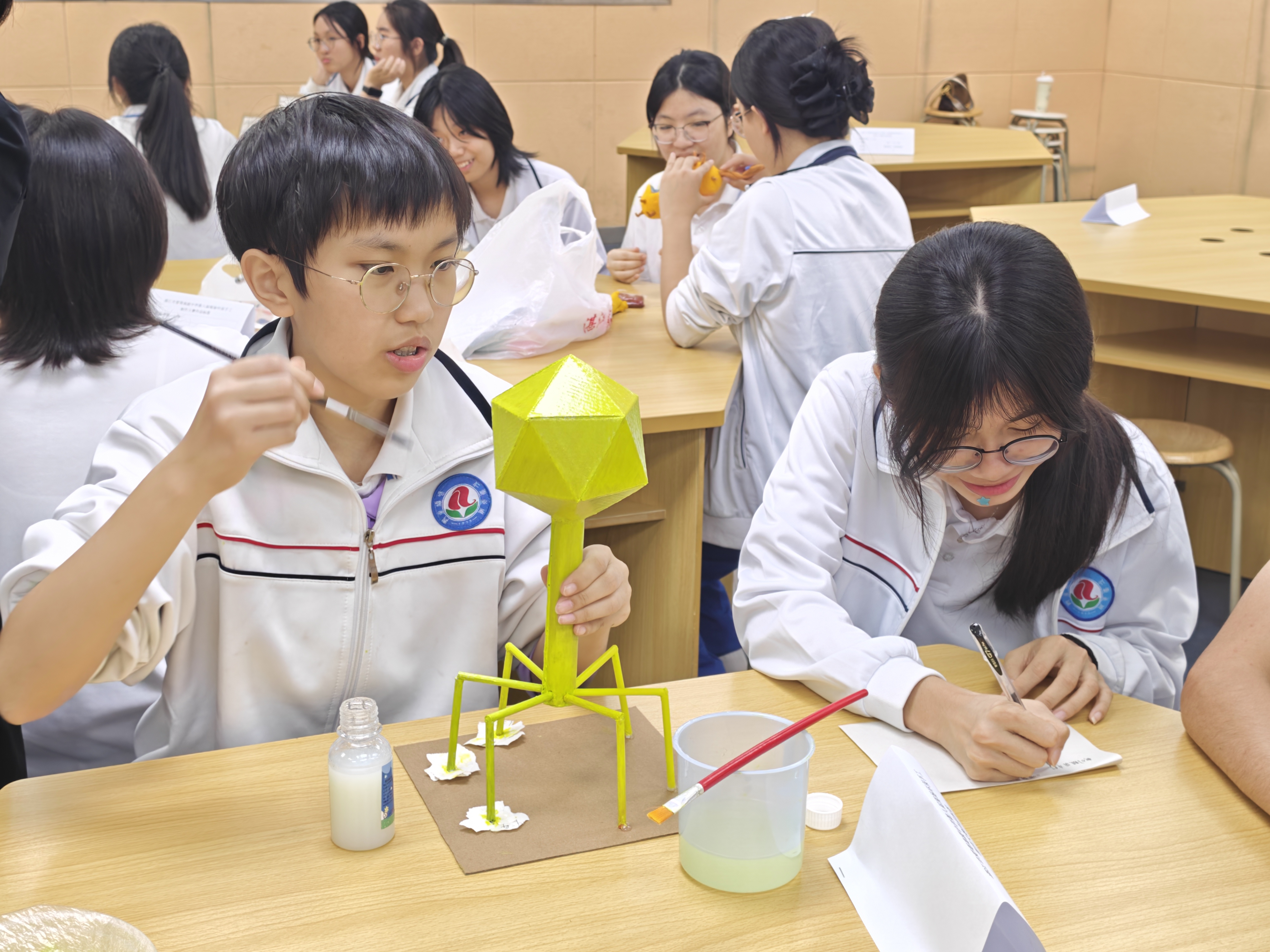 自启动以来,大赛受到师生广泛关注。经班级宣讲与初步选拔,最终15组选手进入决赛。比赛现场,同学们带着收集好的各类废旧材料,迅速投入创作。裁剪、拼接、涂绘、组装……巧手翻飞之间,废料渐渐蜕变:纸箱和塑料瓶化身为人体器官模型,废旧镜片与笔杆组合成简易显微镜,落叶与纸板相融为别致装饰帽。大家专注协作,不时交流思路,老师也在旁适时引导,鼓励同学们既发挥想象,也兼顾实用。