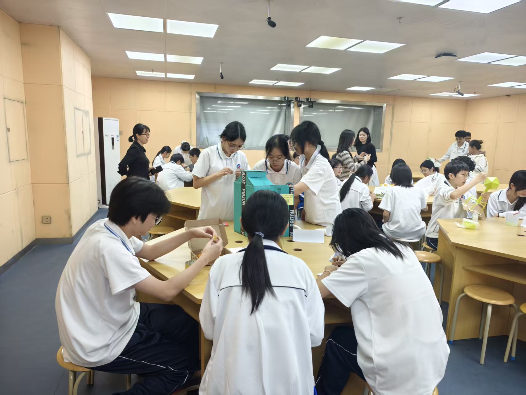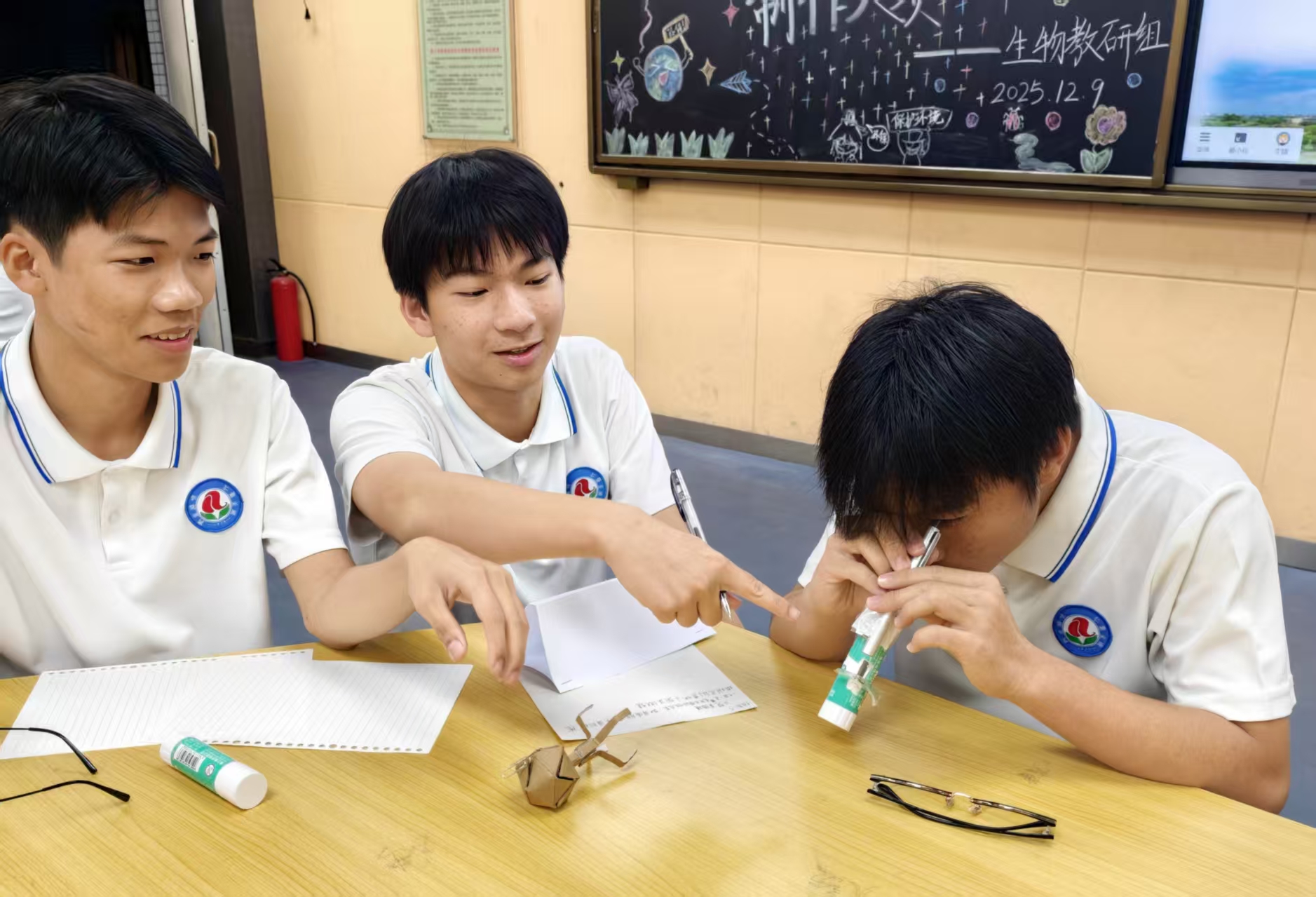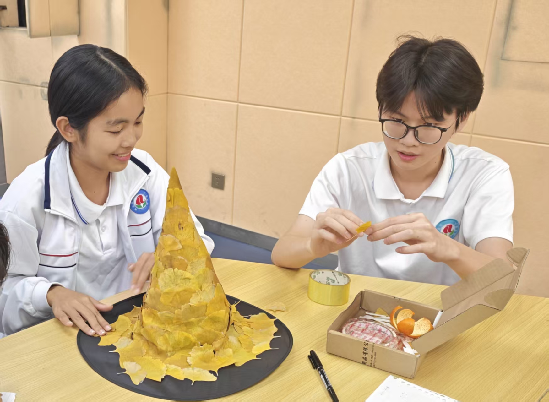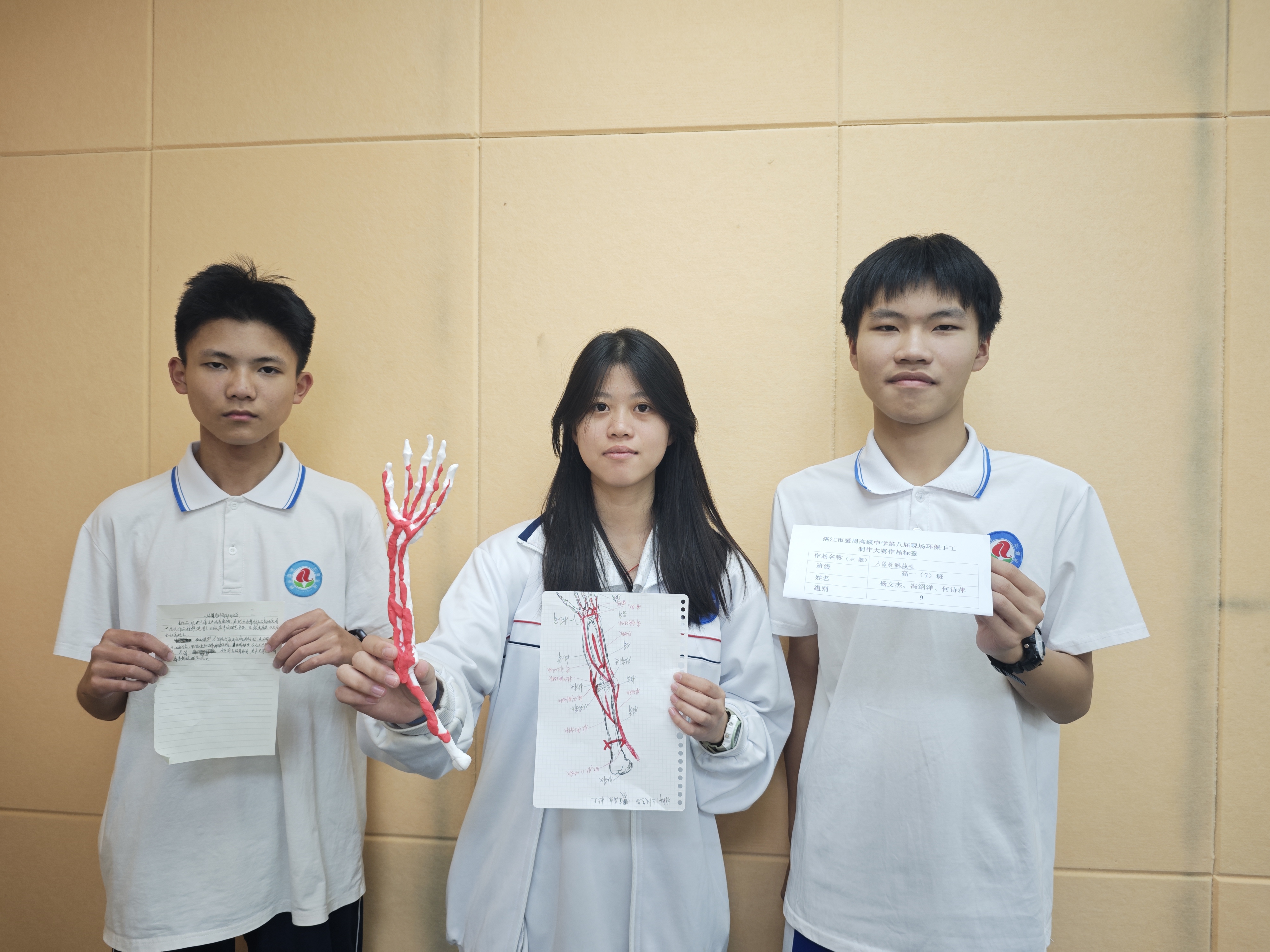 自启动以来,大赛受到师生广泛关注。经班级宣讲与初步选拔,最终15组选手进入决赛。比赛现场,同学们带着收集好的各类废旧材料,迅速投入创作。裁剪、拼接、涂绘、组装……巧手翻飞之间,废料渐渐蜕变:纸箱和塑料瓶化身为人体器官模型,废旧镜片与笔杆组合成简易显微镜,落叶与纸板相融为别致装饰帽。大家专注协作,不时交流思路,老师也在旁适时引导,鼓励同学们既发挥想象,也兼顾实用。