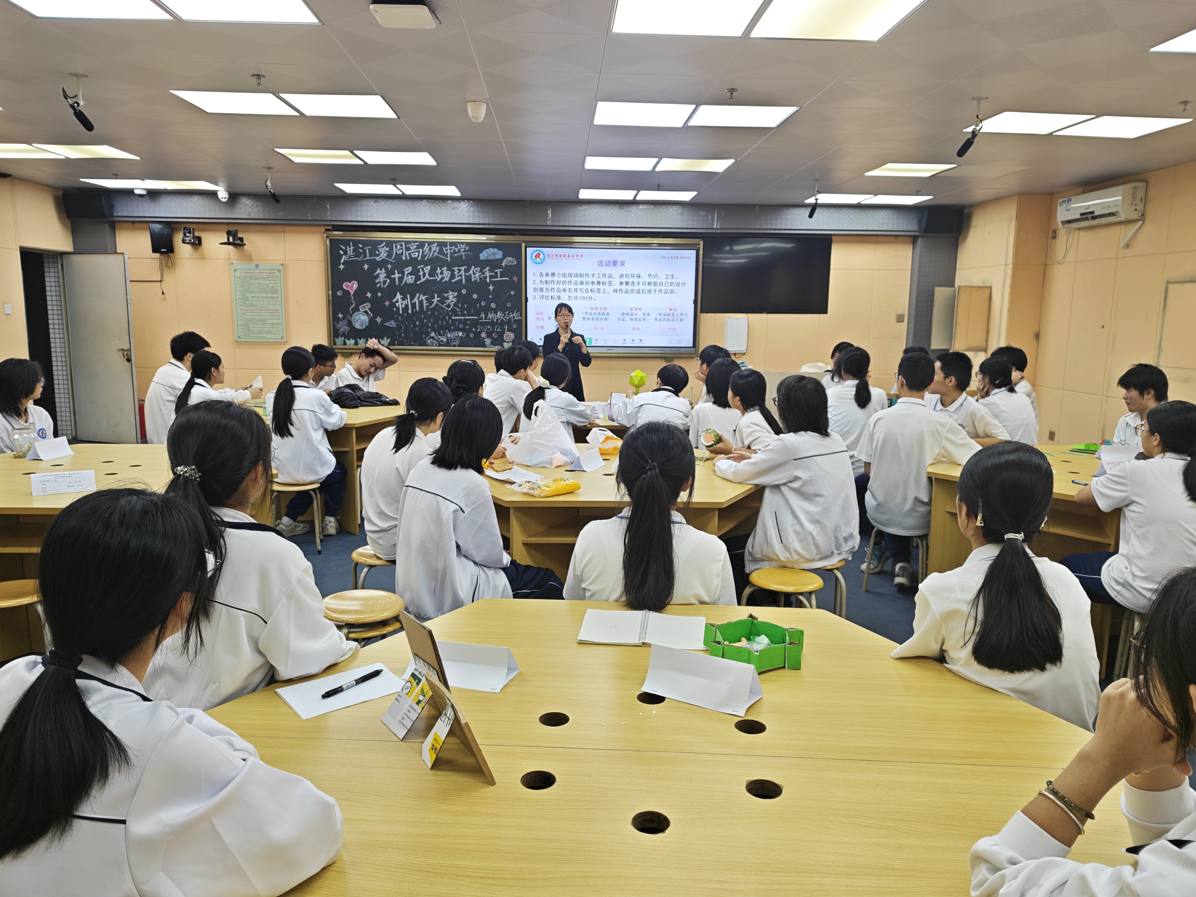 为培养爱护环境的生活好习惯,12月9日,由学校教导处主办、生物教研组承办的第十届现场环保手工制作大赛在和协楼智慧教室举行。