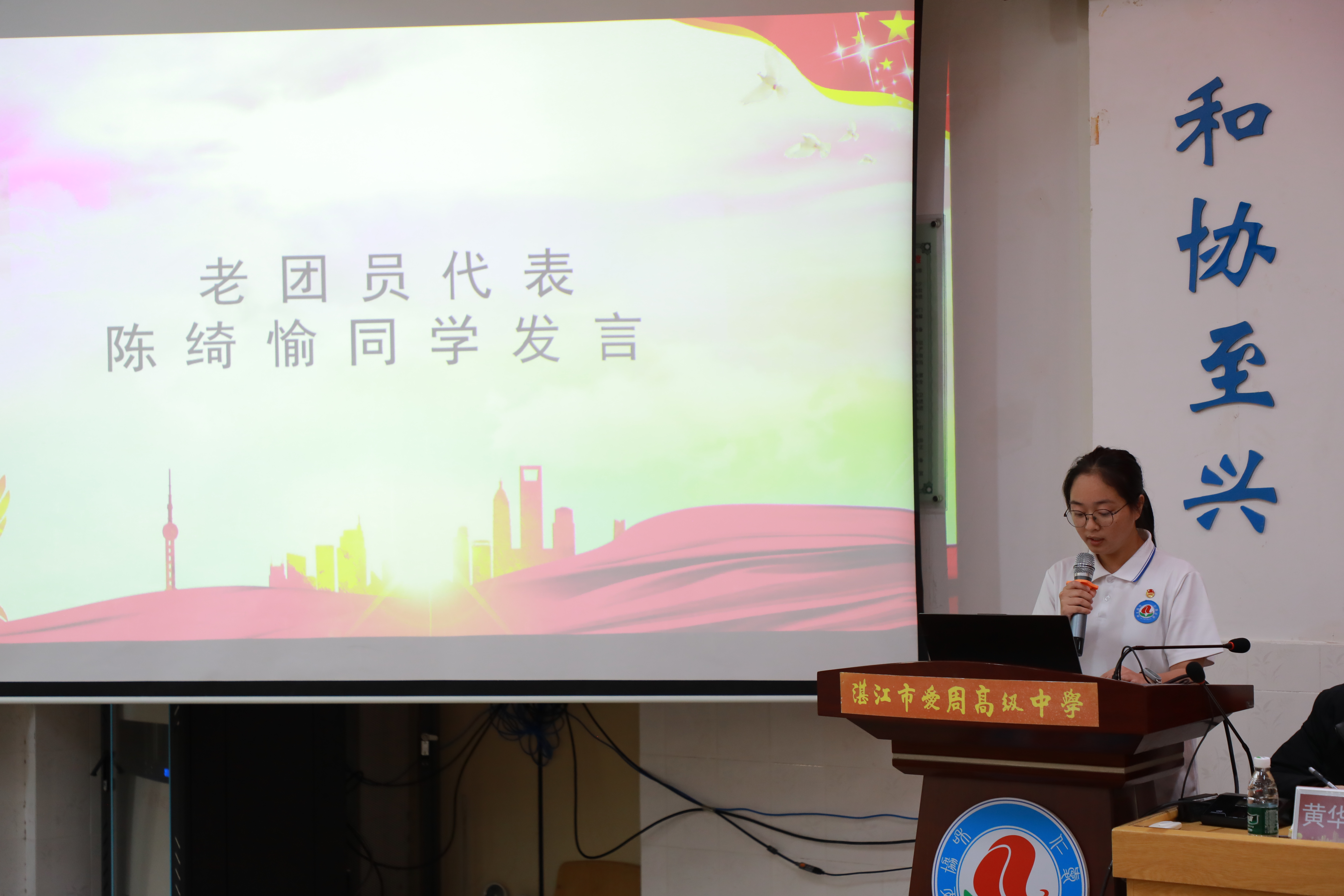 老团员代表、学生会文娱部部长陈绮愉结合自己在团组织中的成长经历,鼓励新团员们不忘初心、勇于担当、保持热情,在青春的跑道上奋力向前,让团徽在奉献中闪耀更明亮的光彩。